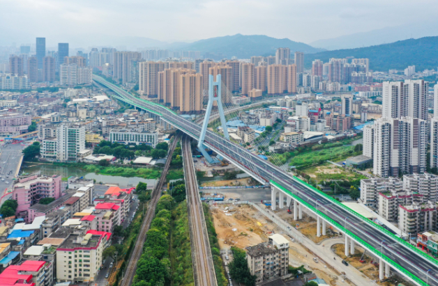 龍巖大道高架橋2013年9月開工建設(shè),2020年10月建成通車。該項(xiàng)目地面道路長3395米,寬78米;高架橋部分長2329米,標(biāo)準(zhǔn)段寬26米,含一座(190+150)米的獨(dú)塔雙索面斜拉橋,斜拉橋?qū)?4.2米;葫蘆溪分洪工程長667米,標(biāo)準(zhǔn)段結(jié)構(gòu)7.5×3.9米,總投資24億元。